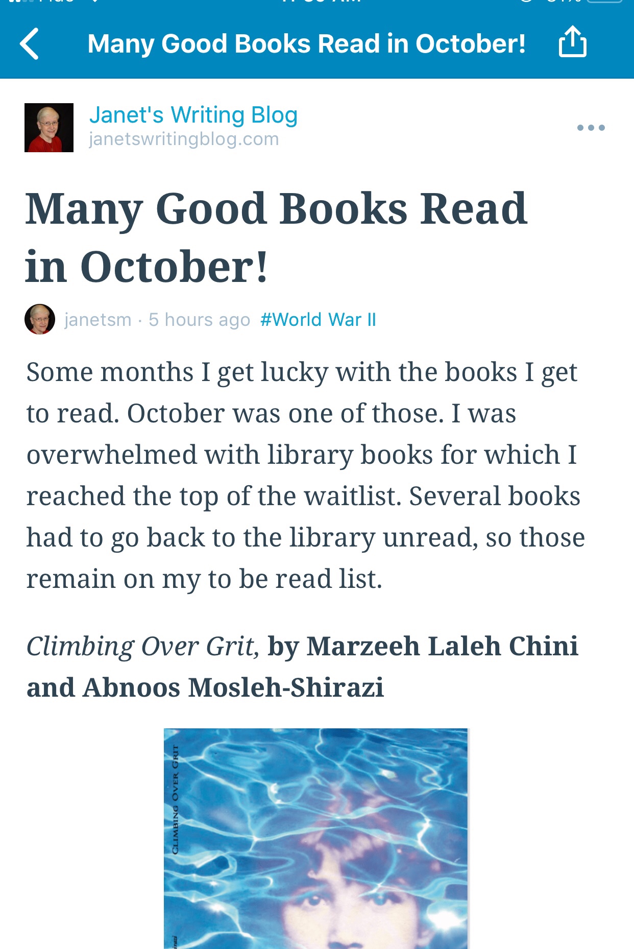 Climbing Over Grit is not a pleasant read, but I highly recommend it to anyone wanting to know more about the child bride culture of Iran. Her blog can be found at https://avoicefromiran.wordpress.com/.