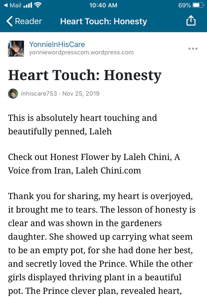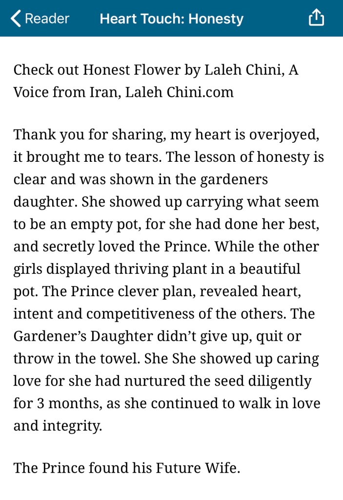“99th” Reviews and comments By Laleh ChiniJuly 25, 2020 ( 5 ) YonnieInHisCare https://wordpress.com/read/blogs/71974057/posts/45001 Share this: Click to share on X (Opens in new window) X Click to share on Facebook (Opens in new window) Facebook Click to share on LinkedIn (Opens in new window) LinkedIn Click to share on Tumblr (Opens in new window) Tumblr Click to share on Telegram (Opens in new window) Telegram Like Loading... Categories: biography, folk tale, memoir, moral, parable, Short StoryTags: biography, memoir, moral, oracle, short stories, Uncategorized Related Articles The Price of Awareness/بهای آگاهی By Laleh Chini4 days ago Reviews and comments By Laleh Chini7 days ago Sense of Modesty/حس فروتنی By Laleh Chini2 weeks ago 5 comments › inhiscare753 July 25, 2020 • 11:47 am You’re very welcome, thanks for sharing so beautifully with your insightful message. LikeLiked by 1 person Reply ↓ Laleh Chini July 25, 2020 • 12:41 pm God bless you dear. LikeLiked by 1 person Reply ↓ inhiscare753 July 25, 2020 • 5:03 pm Thank you 🙏 LikeLiked by 1 person Laleh Chini July 25, 2020 • 8:08 pm 😘🌺 LikeLiked by 1 person inhiscare753 July 25, 2020 • 10:40 pm 💜 LikeLiked by 1 person Leave a comment Cancel reply Δ