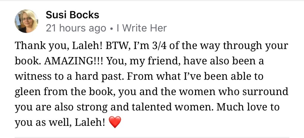 “107th” Reviews and comments By Laleh ChiniSeptember 1, 2020 ( 12 ) Share this: Click to share on X (Opens in new window) X Click to share on Facebook (Opens in new window) Facebook Click to share on LinkedIn (Opens in new window) LinkedIn Click to share on Tumblr (Opens in new window) Tumblr Click to share on Telegram (Opens in new window) Telegram Like Loading... Categories: biography, memoir, moralTags: biography, memoir, moral, Uncategorized Related Articles The Price of Awareness/بهای آگاهی By Laleh Chini1 day ago Reviews and comments By Laleh Chini4 days ago Reviews and comments By Laleh Chini2 weeks ago 12 comments › Bon Repos Gites September 1, 2020 • 12:28 pm Great news! LikeLiked by 1 person Reply ↓ Laleh Chini September 1, 2020 • 12:52 pm Thanks dear. LikeLiked by 1 person Reply ↓ Bon Repos Gites September 1, 2020 • 1:24 pm Always most welcome 🙂 LikeLiked by 1 person Laleh Chini September 1, 2020 • 2:40 pm 🙏🌺 LikeLiked by 1 person Rosaliene Bacchus September 1, 2020 • 12:32 pm Amazing response from your readers. Well done, Laleh! LikeLiked by 1 person Reply ↓ Laleh Chini September 1, 2020 • 12:52 pm Thank you Rosaliene. LikeLiked by 1 person Reply ↓ Susi Bocks September 1, 2020 • 6:34 pm Thanks, Laleh, but you deserve all the credit! I finished it today and have also left a review on Amazon. I wish you much success with this one and looking forward to the next! ❤ LikeLiked by 1 person Reply ↓ Laleh Chini September 1, 2020 • 6:35 pm Awww, means a lot. No one takes time to leave review on Amazon. You’re very kind.🤗❤️😘 LikeLiked by 1 person Reply ↓ Susi Bocks September 1, 2020 • 8:04 pm You’re welcome! 🙂 LikeLiked by 1 person Laleh Chini September 2, 2020 • 12:40 pm 🌺 LikeLiked by 1 person Laleh Chini September 1, 2020 • 6:39 pm It probably takes a few days for me to see, much appreciate it. I will post it on my blog.💕 LikeLiked by 1 person Reply ↓ Susi Bocks September 1, 2020 • 8:04 pm You’re welcome! 🙂 LikeLiked by 1 person Leave a comment Cancel reply Δ