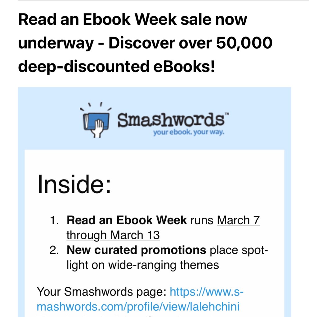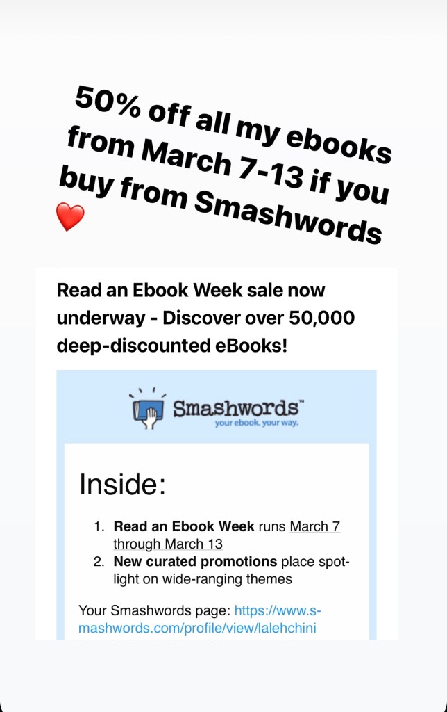 50% Off By Laleh ChiniMarch 7, 2021 ( 6 ) 50% Off all my ebooks if you buy from Smashwords.❤️ Share this: Click to share on X (Opens in new window) X Click to share on Facebook (Opens in new window) Facebook Click to share on LinkedIn (Opens in new window) LinkedIn Click to share on Tumblr (Opens in new window) Tumblr Click to share on Telegram (Opens in new window) Telegram Like Loading... Categories: Short Story Related Articles The Price of Awareness/بهای آگاهی By Laleh Chini3 days ago Sense of Modesty/حس فروتنی By Laleh Chini1 week ago Our Own True Place/جایگاه واقعی ما By Laleh Chini2 weeks ago ( 4 ) 6 comments › OIKOS™-Editorial March 7, 2021 • 10:44 am Thank you for the generous offer, Laleh! Will roll the drums, and wish you a wonderful Sunday! Michael LikeLiked by 2 people Reply ↓ Laleh Chini March 7, 2021 • 7:18 pm That’s very kind of you Michael dear. You too.🌷 LikeLike Reply ↓ Jonathan Caswell March 8, 2021 • 12:27 am Reblogged this on By the Mighty Mumford and commented: THAT SPECIAL TIME HAS COME!!!! 😀 LikeLiked by 1 person Reply ↓ Laleh Chini March 8, 2021 • 6:18 pm Thanks so much.❤️ LikeLiked by 1 person Reply ↓ Jonathan Caswell March 8, 2021 • 6:54 pm You are welcome, dear Laleh! ❤ LikeLiked by 1 person Laleh Chini March 8, 2021 • 7:03 pm 🌷 LikeLiked by 1 person Leave a comment Cancel reply Δ