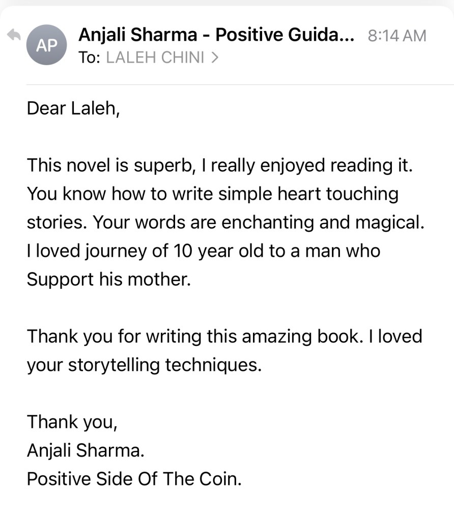 “205th” Review and comments By Laleh ChiniMay 5, 2021 ( 4 ) Share this: Share on X (Opens in new window) X Share on Facebook (Opens in new window) Facebook Share on LinkedIn (Opens in new window) LinkedIn More Share on Tumblr (Opens in new window) Tumblr Share on Reddit (Opens in new window) Reddit Share on Telegram (Opens in new window) Telegram Share on Nextdoor (Opens in new window) Nextdoor Share on Mastodon (Opens in new window) Mastodon Share on Bluesky (Opens in new window) Bluesky Like Loading... Categories: award winner, fiction, moral, Novel Story, StorytellingTags: award winner, fiction, moral, Novel Story Related Articles Grandma Is Becoming Young/مادربزرگ جوان می شود By Laleh Chini5 hours ago ( 10 ) The Ugliest Part of the Human Body/زشتترین عضو بدن انسان By Laleh Chini2 days ago If You Try You Will Succeed/اگر تلاش کنید موفق خواهید شد By Laleh Chini1 week ago ( 6 ) 4 comments › simplywendi May 5, 2021 • 11:43 am you are awesome! LikeLiked by 1 person Reply ↓ Laleh Chini May 5, 2021 • 4:12 pm You’re the best, Wendi.❤️❤️❤️ LikeLiked by 1 person Reply ↓ simplywendi May 6, 2021 • 12:12 pm you are too kind, thank you Laleh! LikeLiked by 1 person Laleh Chini May 6, 2021 • 12:51 pm <3<3<3 LikeLike Leave a comment Cancel reply Δ
