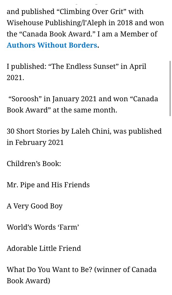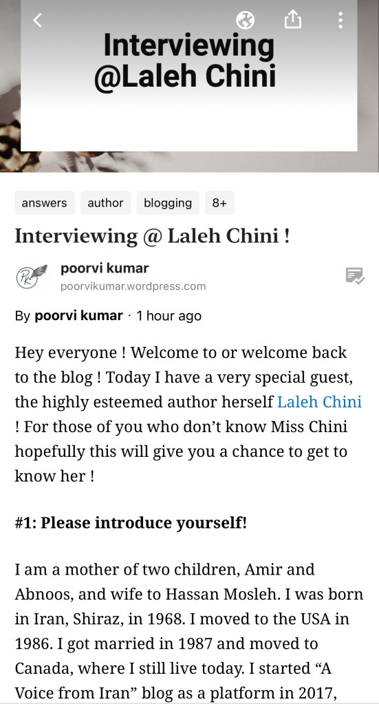 Interview By Laleh ChiniMay 8, 2021 ( 10 ) https://wordpress.com/read/feeds/107816997/posts/3329037399#comments Share this: Click to share on X (Opens in new window) X Click to share on Facebook (Opens in new window) Facebook Click to share on LinkedIn (Opens in new window) LinkedIn Click to share on Tumblr (Opens in new window) Tumblr Click to share on Telegram (Opens in new window) Telegram Like Loading... Categories: adult picture book, award winner, bedtime story, biography, fable, fiction, memoir, moral, nonfiction, Novel Story, picture book, short stories picture book, Short Story, world war IITags: fiction, non-fiction Related Articles The Price of Awareness/بهای آگاهی By Laleh Chini1 day ago Reviews and comments By Laleh Chini4 days ago Sense of Modesty/حس فروتنی By Laleh Chini1 week ago 10 comments › Anita Bowden May 8, 2021 • 12:25 pm Congratulations on the interview, Laleh, and for your continuing book writing successes! All well-deserved!! 🙂 ❤ LikeLiked by 2 people Reply ↓ Laleh Chini May 8, 2021 • 12:26 pm You are an amazing friend my dear Anita, much love. LikeLiked by 2 people Reply ↓ ivor20 May 8, 2021 • 6:38 pm Congratulations Laleh … and I enjoyed yourinterview … LikeLiked by 1 person Reply ↓ Laleh Chini May 8, 2021 • 8:39 pm You’re very kind dear Ivor.🌷 LikeLiked by 1 person Reply ↓ ivor20 May 8, 2021 • 8:44 pm Always my pleasure to visit you in Canada … I’ve a cousins in Vancouver, Calary, and Wainwright, originally they were brought up in ‘High River’.. 😀 LikeLiked by 1 person Laleh Chini May 8, 2021 • 8:47 pm Awww, that’s nice.🌺 LikeLiked by 1 person vincenza63 May 9, 2021 • 7:25 pm I love your kindness and the gentle touch of your words, Laleh ❤ God bless you! Vicky LikeLiked by 1 person Reply ↓ Laleh Chini May 9, 2021 • 9:33 pm You’re amazing, appreciate it.❤️ LikeLike Reply ↓ Ren May 11, 2021 • 9:54 am Wonderful interview! What fun you are having!! I cannot begin to express how happy….. no, not happy…hmmm …..how extremely ELATED I am for your success in writing. Keep up the grand works, Laleh. Hugz always! LikeLiked by 1 person Reply ↓ Laleh Chini May 11, 2021 • 12:10 pm Hugs back to my dear Ren, you have a golden heart. LikeLiked by 1 person Reply ↓ Leave a comment Cancel reply Δ