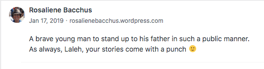 Reviews and comments By Laleh ChiniJuly 3, 2021 ( 4 ) All related to my book “30 Short Stories by Laleh Chini” Share this: Share on X (Opens in new window) X Share on Facebook (Opens in new window) Facebook Share on LinkedIn (Opens in new window) LinkedIn Share on Tumblr (Opens in new window) Tumblr Share on Telegram (Opens in new window) Telegram Like Loading... Categories: adult picture book, bedtime story, moral, picture book, short stories picture book, Short StoryTags: moral, short stories, short stories picture book Related Articles Reviews and comments By Laleh Chini14 hours ago Fathollahβs big talk/Ψ΅ΨΨ¨ΨͺβΩΨ§Ϋ Ω ΩΩ ΩΨͺΨβΨ§ΩΩΩ By Laleh Chini5 days ago Reviews and comments By Laleh Chini1 week ago 4 comments › Lokesh Sastya July 3, 2021 • 8:06 am Wow! ππ LikeLiked by 1 person Reply ↓ Laleh Chini July 3, 2021 • 7:05 pm Thanks dear.π LikeLiked by 1 person Reply ↓ markbierman July 11, 2021 • 8:06 am Congratulations on the excellent reviews! LikeLiked by 1 person Reply ↓ Laleh Chini July 11, 2021 • 6:49 pm Means a lot dear.π· LikeLiked by 1 person Reply ↓ Leave a comment Cancel reply Δ