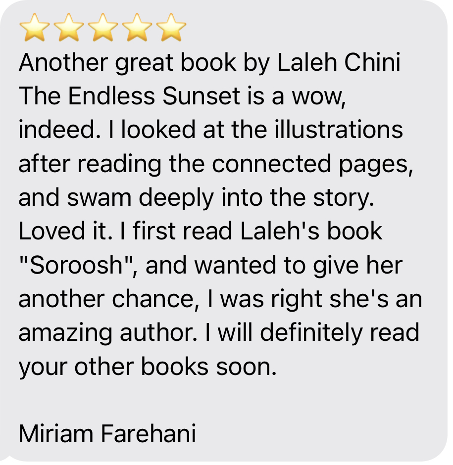 Reviews and comments By Laleh ChiniAugust 16, 2021 ( 8 ) Share this: Click to share on X (Opens in new window) X Click to share on Facebook (Opens in new window) Facebook Click to share on LinkedIn (Opens in new window) LinkedIn Click to share on Tumblr (Opens in new window) Tumblr Click to share on Telegram (Opens in new window) Telegram Like Loading... Categories: adult picture book, fiction, moral, Novel Story, picture book, world war IITags: adult picture book, Novel Story, picture book adult, world war II Related Articles The Price of Awareness/بهای آگاهی By Laleh Chini1 day ago Reviews and comments By Laleh Chini4 days ago Reviews and comments By Laleh Chini2 weeks ago 8 comments › janetsm August 16, 2021 • 10:26 am Laleh, I am so pleased for you that The Endless Sunset is receiving so many great reviews! Congratulations on its success! LikeLiked by 2 people Reply ↓ Laleh Chini August 16, 2021 • 1:03 pm Thanks a million Janet.❤️❤️❤️ LikeLike Reply ↓ Americaoncoffee August 18, 2021 • 6:01 am You are very diversified. Congratulations! LikeLiked by 1 person Reply ↓ Laleh Chini August 18, 2021 • 6:18 pm Thanks a million sweetheart.🌺 LikeLiked by 2 people Reply ↓ Americaoncoffee August 20, 2021 • 7:40 am Delighted! Have an enjoyable weekend!🎼🍮🍮 LikeLiked by 2 people Laleh Chini August 20, 2021 • 8:49 am U too sweetheart. LikeLiked by 1 person Zubin Khan Pathan August 22, 2021 • 7:14 am Love your blogs LikeLiked by 2 people Reply ↓ Laleh Chini August 22, 2021 • 9:47 am Awww, thanks so much dear.❤️ LikeLiked by 2 people Reply ↓ Leave a comment Cancel reply Δ