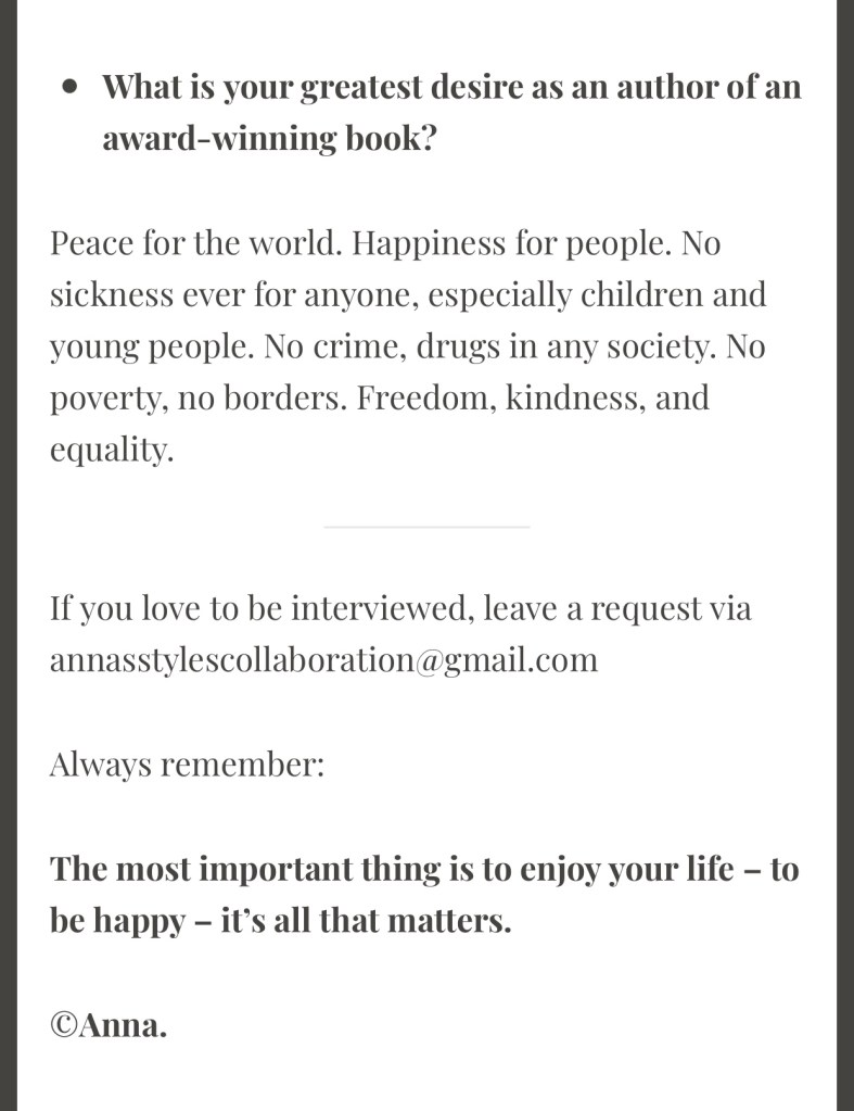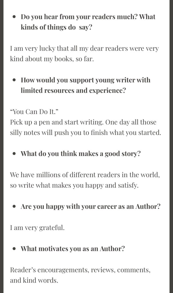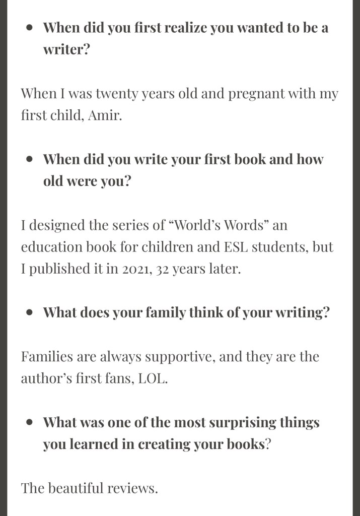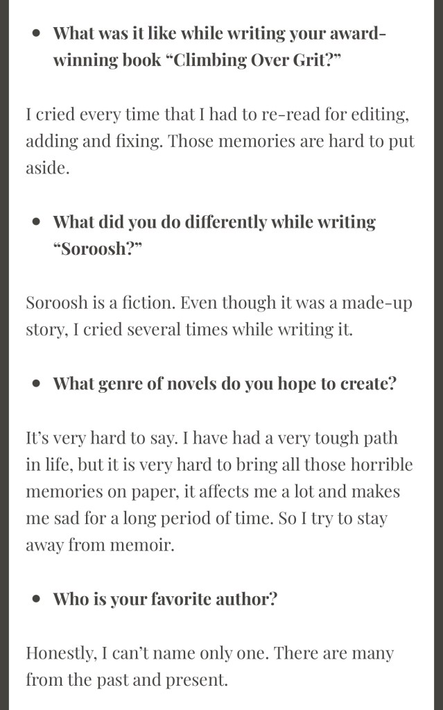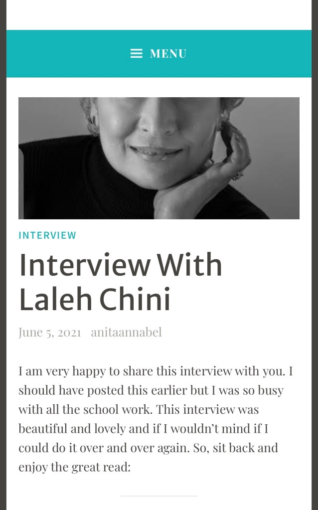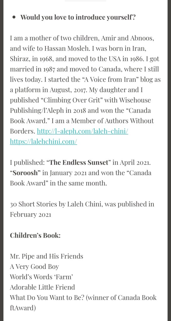 Interview By Laleh ChiniNovember 16, 2021 ( 30 ) http://annaanitasblog.com/2021/06/05/interview-with-laleh-chini/ Share this: Click to share on X (Opens in new window) X Click to share on Facebook (Opens in new window) Facebook Click to share on LinkedIn (Opens in new window) LinkedIn Click to share on Tumblr (Opens in new window) Tumblr Click to share on Telegram (Opens in new window) Telegram Like Loading... Categories: award winner, biography, fiction, memoir, Novel Story, short stories picture book, Short StoryTags: fiction, memoir, Novel Story, short stories Related Articles The Price of Awareness/Ψ¨ΩΨ§Ϋ Ψ’Ϊ―Ψ§ΩΫ By Laleh Chini1 day ago Reviews and comments By Laleh Chini4 days ago Sense of Modesty/ΨΨ³ ΩΨ±ΩΨͺΩΫ By Laleh Chini1 week ago 30 comments › ivor20 November 16, 2021 • 4:32 pm I adored you interview answers Laleh, thank you for sharing .. πππ LikeLiked by 2 people Reply ↓ Laleh Chini November 16, 2021 • 5:36 pm Youβre amazing Ivor, thanks for reading.β€οΈπ· LikeLiked by 2 people Reply ↓ ivor20 November 16, 2021 • 5:49 pm Youβre welcome Laleh LikeLiked by 2 people Laleh Chini November 16, 2021 • 7:27 pm π· LikeLike Ultra November 16, 2021 • 4:39 pm Congratulations π LikeLiked by 1 person Reply ↓ Laleh Chini November 16, 2021 • 5:46 pm Thanks so much dear.π· LikeLike Reply ↓ Susi Bocks November 16, 2021 • 7:24 pm Great interview, Laleh! When you talked about staying away from a memoir it reminded me of my journey. Talking/writing about it was too depressing. Maybe one day but not yet. LikeLiked by 2 people Reply ↓ Laleh Chini November 16, 2021 • 7:28 pm Thanks so much dear. Yes, itβs very hard. Life is so tough.π₯Ί LikeLiked by 2 people Reply ↓ Susi Bocks November 16, 2021 • 9:58 pm But maybe with recollection it will get easier? IDK, whatever happens, happens. π LikeLiked by 2 people Laleh Chini November 18, 2021 • 4:39 pm β€οΈβ€οΈβ€οΈ LikeLiked by 2 people www.corneliaweber-photography.com November 16, 2021 • 9:14 pm I enjoyed your interview, you are a very humbled soul LikeLiked by 2 people Reply ↓ Laleh Chini November 18, 2021 • 4:38 pm Youβre an amazing friend.β€οΈ LikeLiked by 2 people Reply ↓ Sadje November 17, 2021 • 6:52 am What a lovely interview. Itβs great to read some details about you. LikeLiked by 2 people Reply ↓ Laleh Chini November 18, 2021 • 4:42 pm Thatβs very kind of you dear.π· LikeLiked by 2 people Reply ↓ Sadje November 18, 2021 • 9:20 pm Youβre welcome β€οΈ LikeLiked by 2 people Laleh Chini November 19, 2021 • 3:47 pm π· LikeLiked by 2 people Laleh Chini November 19, 2021 • 3:47 pm π LikeLiked by 1 person usfman November 17, 2021 • 3:50 pm Iβve come across some brilliant scholars from Iran in my academic path as a college professor. I can ad. your name I hope to this legacy. LikeLiked by 1 person Reply ↓ Laleh Chini November 18, 2021 • 4:45 pm Awww, youβre amazing, thanks so much.π· LikeLiked by 1 person Reply ↓ Clare Pooley November 17, 2021 • 4:07 pm An excellent interview, Laleh. LikeLiked by 1 person Reply ↓ Laleh Chini November 18, 2021 • 5:13 pm Thanks a million dear.β€οΈ LikeLiked by 2 people Reply ↓ Clare Pooley November 18, 2021 • 5:21 pm β€ LikeLiked by 1 person bigskybuckeye November 17, 2021 • 7:16 pm Laleh, it was such a pleasure to read this interview. Thanks so much. I also appreciate your encouraging words to other writers. LikeLiked by 2 people Reply ↓ Laleh Chini November 18, 2021 • 5:14 pm Thatβs very kind of you dear. Appreciate it.β€οΈ LikeLiked by 2 people Reply ↓ Monalisa January 12, 2022 • 10:30 pm Thank you so much for sharing! LikeLiked by 1 person Reply ↓ Laleh Chini January 13, 2022 • 6:56 pm Thanks for your kindness dear.β€οΈ LikeLike Reply ↓ Monalisa January 14, 2022 • 2:46 am π LikeLiked by 1 person Monalisa January 12, 2022 • 10:54 pm Finally, followed your blog…. LikeLiked by 1 person Reply ↓ Laleh Chini January 13, 2022 • 6:57 pm Youβre very kind.π LikeLike Reply ↓ Monalisa January 14, 2022 • 2:45 am π LikeLiked by 1 person Leave a comment Cancel reply Δ