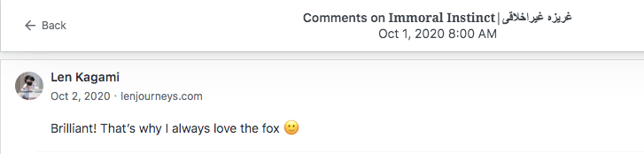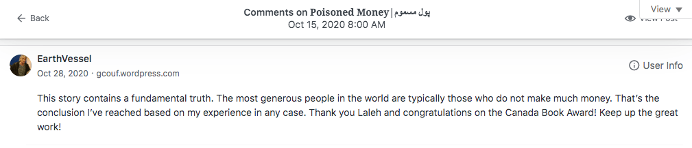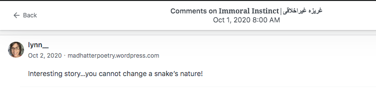 Reviews and comments By Laleh ChiniJanuary 7, 2023 ( 10 ) Thank you. Share this: Click to share on X (Opens in new window) X Click to share on Facebook (Opens in new window) Facebook Click to share on LinkedIn (Opens in new window) LinkedIn Click to share on Tumblr (Opens in new window) Tumblr Click to share on Telegram (Opens in new window) Telegram Like Loading... Categories: bedtime story, fable, folk tale, moral, parable, Short Story, StorytellingTags: moral, narrative, parable, short stories, Uncategorized Related Articles The Price of Awareness/بهای آگاهی By Laleh Chini1 day ago Reviews and comments By Laleh Chini4 days ago Sense of Modesty/حس فروتنی By Laleh Chini1 week ago 10 comments › Cindy Georgakas January 7, 2023 • 1:27 pm Congratulations Gorgeous Laleh! 💞 LikeLiked by 1 person Reply ↓ Laleh Chini January 9, 2023 • 12:12 pm Thanks a million sweetheart.😘 LikeLike Reply ↓ Louis January 8, 2023 • 4:12 am Happy New Year Laleh! Friendly kisses from Auvergne (France). ❤ LikeLiked by 1 person Reply ↓ Laleh Chini January 9, 2023 • 12:11 pm Happy new new year dear Louis.💕 LikeLiked by 1 person Reply ↓ worldphoto12 January 12, 2023 • 3:40 am buona giornata LikeLiked by 1 person Reply ↓ Laleh Chini January 14, 2023 • 4:59 pm 🙏💝 LikeLiked by 1 person Reply ↓ worldphoto12 January 31, 2023 • 3:32 pm ti auguro una splendida serata LikeLiked by 1 person Reply ↓ Laleh Chini January 31, 2023 • 6:53 pm Appreciate your support.❤️ LikeLiked by 1 person Reply ↓ worldphoto12 February 6, 2023 • 6:38 am BUON INIZIO SETTIMANA LikeLiked by 1 person Reply ↓ Laleh Chini February 7, 2023 • 4:24 pm Appreciate it.🌷 LikeLiked by 1 person Reply ↓ Leave a comment Cancel reply Δ