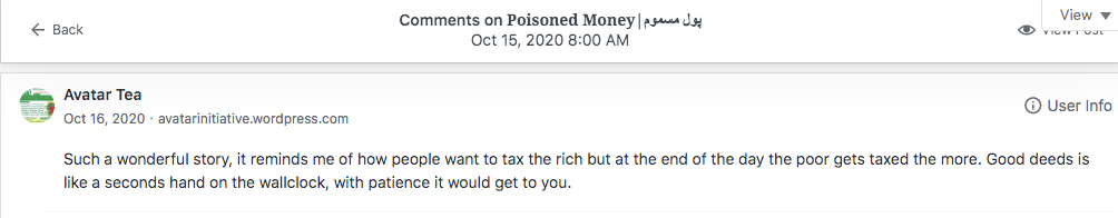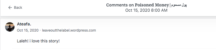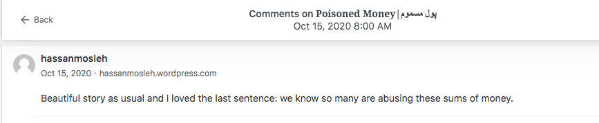Reviews and comments By Laleh ChiniJanuary 14, 2023 ( 7 ) Thank you. Share this: Click to share on X (Opens in new window) X Click to share on Facebook (Opens in new window) Facebook Click to share on LinkedIn (Opens in new window) LinkedIn Click to share on Tumblr (Opens in new window) Tumblr Click to share on Telegram (Opens in new window) Telegram Like Loading... Categories: award winner, bedtime story, fable, folk tale, moral, Short Story, StorytellingTags: moral, narrative, parable, short stories, Uncategorized Related Articles The Price of Awareness/Ψ¨ΩΨ§Ϋ Ψ’Ϊ―Ψ§ΩΫ By Laleh Chini2 days ago Reviews and comments By Laleh Chini5 days ago Sense of Modesty/ΨΨ³ ΩΨ±ΩΨͺΩΫ By Laleh Chini1 week ago 7 comments › sherazade January 14, 2023 • 2:03 pm Havea nice sunday β€οΈβ€οΈβ€οΈ LikeLiked by 1 person Reply ↓ Laleh Chini January 14, 2023 • 4:53 pm You too sweetest friend from the beautiful Italy.πππ LikeLike Reply ↓ sherazade January 14, 2023 • 5:16 pm Waiting for you anytimeβοΈβοΈβοΈπ LikeLiked by 1 person Laleh Chini January 15, 2023 • 5:51 pm Awww π LikeLiked by 1 person Cindy Georgakas January 14, 2023 • 5:00 pm Well deserved and happy Sunday night I think to you Laleh! π LikeLiked by 1 person Reply ↓ Laleh Chini January 14, 2023 • 5:09 pm Thanks so much Cindy.π LikeLiked by 1 person Reply ↓ Cindy Georgakas January 14, 2023 • 5:16 pm You’re so welcome dear! β€οΈ LikeLiked by 1 person Leave a comment Cancel reply Δ