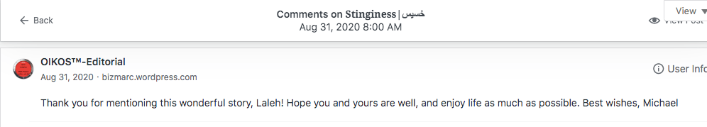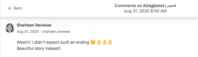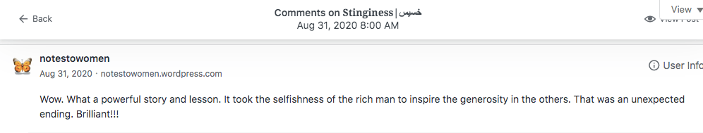 Reviews and comments By Laleh ChiniFebruary 11, 2023 Thank you. Share this: Click to share on X (Opens in new window) X Click to share on Facebook (Opens in new window) Facebook Click to share on LinkedIn (Opens in new window) LinkedIn Click to share on Tumblr (Opens in new window) Tumblr Click to share on Telegram (Opens in new window) Telegram Like Loading... Categories: award winner, fable, folk tale, moral, parable, Short Story, StorytellingTags: moral, narrative, parable, short stories, Uncategorized Related Articles The Price of Awareness/بهای آگاهی By Laleh Chini2 days ago Reviews and comments By Laleh Chini5 days ago Sense of Modesty/حس فروتنی By Laleh Chini1 week ago Leave a comment Cancel reply Δ