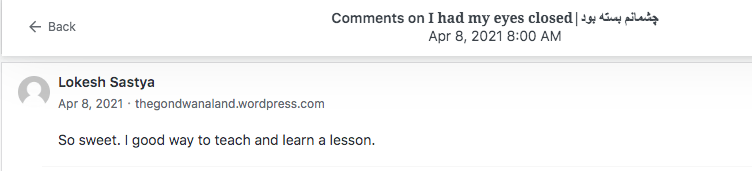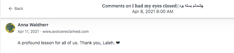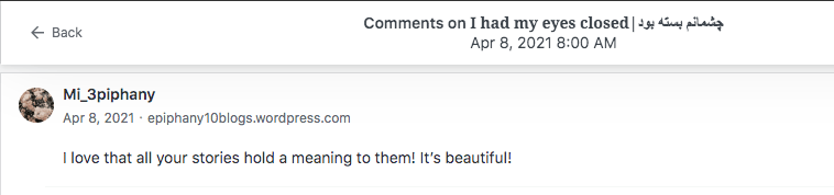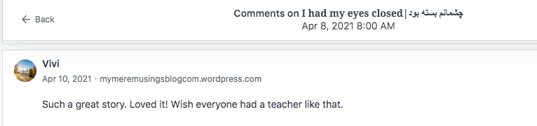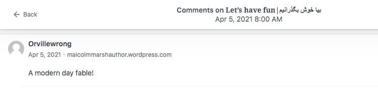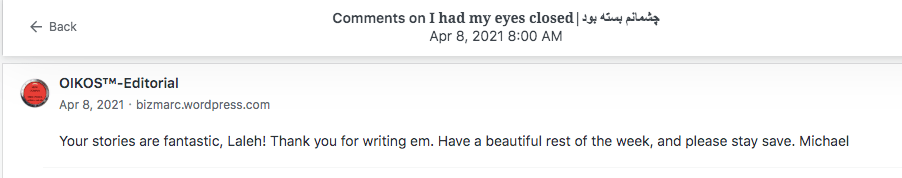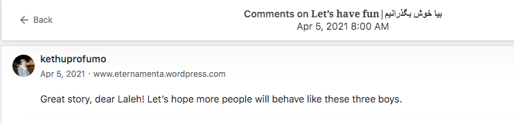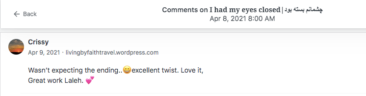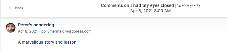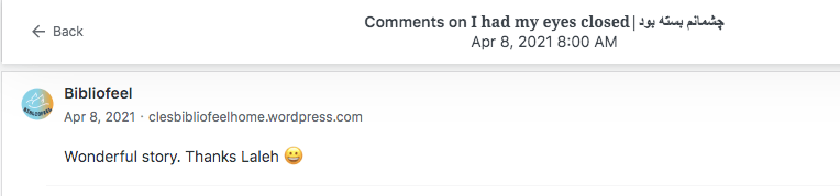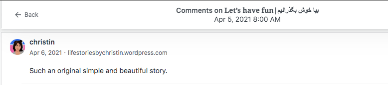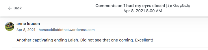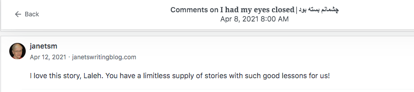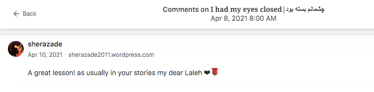 Reviews and comments By Laleh ChiniJune 17, 2023 ( 5 ) Thank you. Share this: Click to share on X (Opens in new window) X Click to share on Facebook (Opens in new window) Facebook Click to share on LinkedIn (Opens in new window) LinkedIn Click to share on Tumblr (Opens in new window) Tumblr Click to share on Telegram (Opens in new window) Telegram Like Loading... Categories: award winner, bedtime story, fable, folk tale, moral, Short Story, Storytelling, taleTags: moral, narrative, oracle, parable, short stories, Uncategorized Related Articles Be That One/آن یکی باش By Laleh Chini13 hours ago Reviews and comments By Laleh Chini4 days ago The Price of Awareness/بهای آگاهی By Laleh Chini1 week ago 5 comments › #hhhigh June 17, 2023 • 7:21 am Great blog , thanks for your all posts Laleh, love from Australia LikeLiked by 1 person Reply ↓ Laleh Chini June 17, 2023 • 11:19 pm Appreciate your kindness dear friend.🌷 LikeLiked by 1 person Reply ↓ aruna3 June 20, 2023 • 3:58 pm A bunch of congratulations.❤💐❤ LikeLiked by 1 person Reply ↓ Laleh Chini June 20, 2023 • 6:41 pm Appreciate your kindness dear.💝💝💝 LikeLike Reply ↓ aruna3 June 21, 2023 • 12:57 pm Most welcome,dear!!❤💓❤ LikeLiked by 1 person Leave a comment Cancel reply Δ