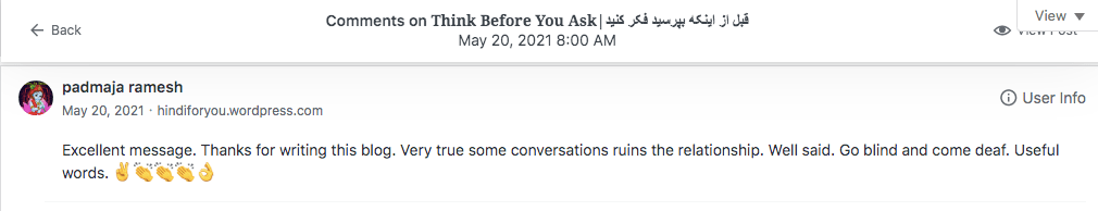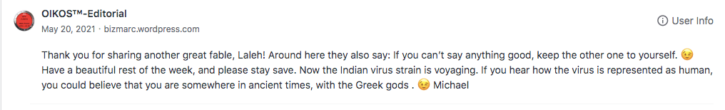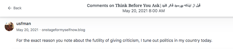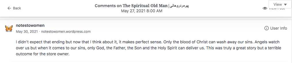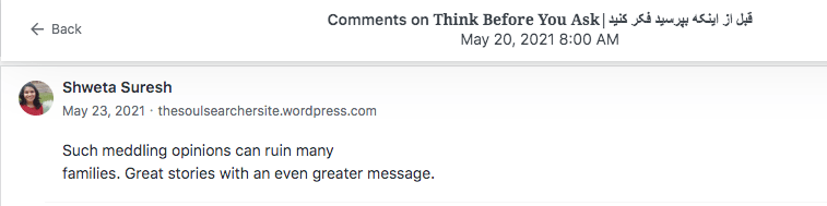 Reviews and comments By Laleh ChiniJuly 1, 2023 Thank you. Share this: Click to share on X (Opens in new window) X Click to share on Facebook (Opens in new window) Facebook Click to share on LinkedIn (Opens in new window) LinkedIn Click to share on Tumblr (Opens in new window) Tumblr Click to share on Telegram (Opens in new window) Telegram Like Loading... Categories: award winner, bedtime story, folk tale, moral, short stories picture book, taleTags: moral, narrative, oracle, short stories, Uncategorized Related Articles Be That One/آن یکی باش By Laleh Chini20 hours ago Reviews and comments By Laleh Chini4 days ago The Price of Awareness/بهای آگاهی By Laleh Chini1 week ago Leave a comment Cancel reply Δ