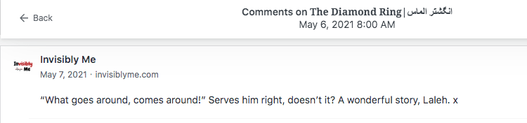 Reviews and comments By Laleh ChiniJuly 8, 2023 ( 2 ) Thank you. Share this: Click to share on X (Opens in new window) X Click to share on Facebook (Opens in new window) Facebook Click to share on LinkedIn (Opens in new window) LinkedIn Click to share on Tumblr (Opens in new window) Tumblr Click to share on Telegram (Opens in new window) Telegram Like Loading... Categories: adult picture book, award winner, children book, moral, Novel Story, Short Story, StorytellingTags: award winner, biography, moral, Novel Story, short stories, Uncategorized Related Articles Our Own True Place/جایگاه واقعی ما By Laleh Chini1 day ago Reviews and comments By Laleh Chini4 days ago Expensive Return Ticket/بلیط رفت و برگشت گرانقیمت By Laleh Chini1 week ago 2 comments › Roksana Amelia July 9, 2023 • 1:26 pm Wonderful reviews … Happy feelings ♥️♥️♥️ LikeLiked by 1 person Reply ↓ Laleh Chini July 9, 2023 • 3:06 pm That’s very kind of you dear.💝💝💝 LikeLike Reply ↓ Leave a comment Cancel reply Δ