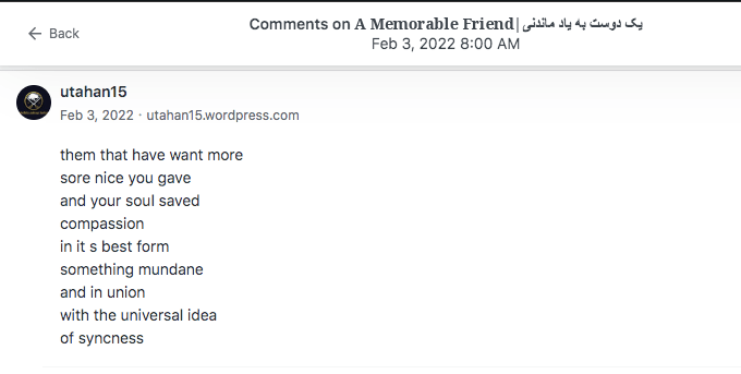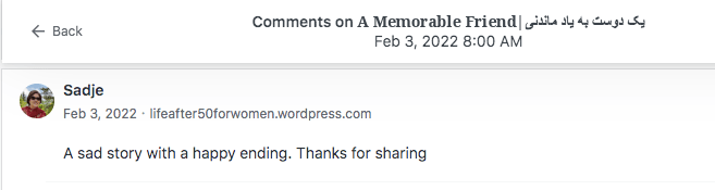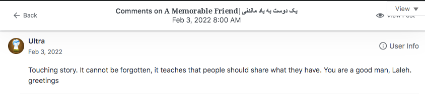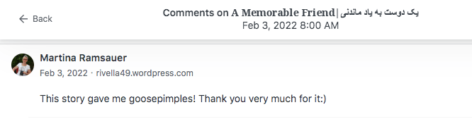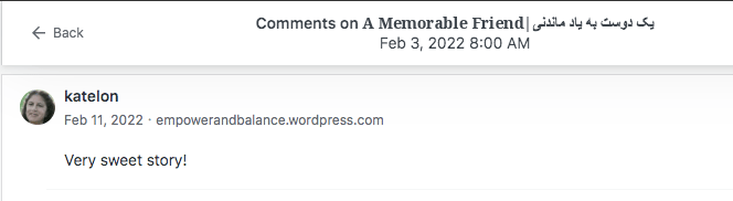 Reviews and comments By Laleh ChiniNovember 25, 2023 ( 4 ) Thank You. Share this: Click to share on X (Opens in new window) X Click to share on Facebook (Opens in new window) Facebook Click to share on LinkedIn (Opens in new window) LinkedIn Click to share on Tumblr (Opens in new window) Tumblr Click to share on Telegram (Opens in new window) Telegram Like Loading... Categories: bedtime story, fable, folk tale, moral, StorytellingTags: moral, narrative, parable, short stories, Uncategorized Related Articles Our Own True Place/جایگاه واقعی ما By Laleh Chini1 day ago Reviews and comments By Laleh Chini4 days ago Expensive Return Ticket/بلیط رفت و برگشت گرانقیمت By Laleh Chini1 week ago 4 comments › sherazade November 25, 2023 • 8:15 am Love❤️ LikeLiked by 1 person Reply ↓ Laleh Chini November 25, 2023 • 5:15 pm 😘😍❤️ LikeLike Reply ↓ titti________ November 25, 2023 • 11:28 am 🌹 LikeLiked by 1 person Reply ↓ Laleh Chini November 25, 2023 • 5:15 pm ❤️ LikeLiked by 1 person Reply ↓ Leave a comment Cancel reply Δ