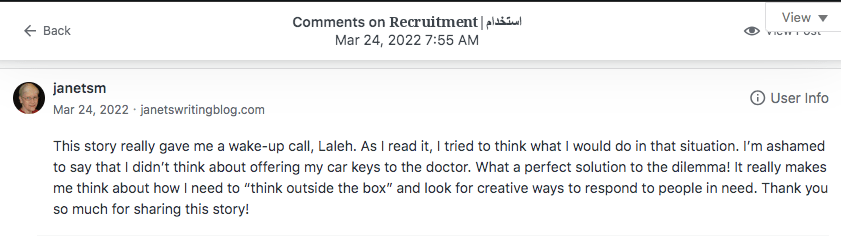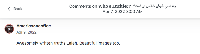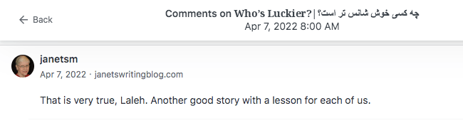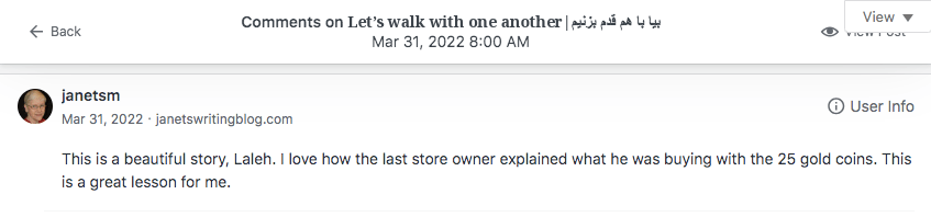 Reviews and comments By Laleh ChiniDecember 9, 2023 ( 4 ) Thank You. Share this: Click to share on X (Opens in new window) X Click to share on Facebook (Opens in new window) Facebook Click to share on LinkedIn (Opens in new window) LinkedIn Click to share on Tumblr (Opens in new window) Tumblr Click to share on Telegram (Opens in new window) Telegram Like Loading... Categories: bedtime story, fable, moral, Short Story, StorytellingTags: moral, oracle, parable, short stories, Uncategorized Related Articles Our Own True Place/جایگاه واقعی ما By Laleh Chini2 days ago Reviews and comments By Laleh Chini5 days ago Expensive Return Ticket/بلیط رفت و برگشت گرانقیمت By Laleh Chini1 week ago 4 comments › Cindy Georgakas December 9, 2023 • 4:19 pm ❤️❤️❤️ LikeLiked by 1 person Reply ↓ Laleh Chini December 10, 2023 • 8:14 pm 😘😘😘 LikeLike Reply ↓ 100 Country Trek December 11, 2023 • 5:59 am Thanks for sharing this idea Anita LikeLiked by 1 person Reply ↓ Laleh Chini December 12, 2023 • 3:58 pm Thanks Anita.🌷 LikeLiked by 1 person Reply ↓ Leave a comment Cancel reply Δ