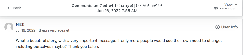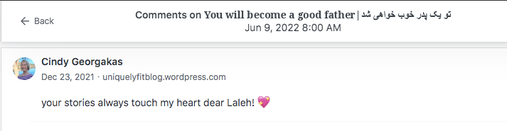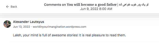 Reviews and comments By Laleh ChiniDecember 23, 2023 ( 2 ) Thank you. Share this: Click to share on X (Opens in new window) X Click to share on Facebook (Opens in new window) Facebook Click to share on LinkedIn (Opens in new window) LinkedIn Click to share on Tumblr (Opens in new window) Tumblr Click to share on Telegram (Opens in new window) Telegram Like Loading... Categories: award winner, fable, moral, Storytelling, taleTags: moral, oracle, parable, short stories, Uncategorized Related Articles Our Own True Place/جایگاه واقعی ما By Laleh Chini1 day ago Reviews and comments By Laleh Chini4 days ago Expensive Return Ticket/بلیط رفت و برگشت گرانقیمت By Laleh Chini1 week ago 2 comments › christinenovalarue December 23, 2023 • 8:50 am 🩵🩵 LikeLiked by 2 people Reply ↓ Laleh Chini December 23, 2023 • 6:30 pm 😍❤️ LikeLike Reply ↓ Leave a comment Cancel reply Δ