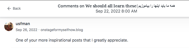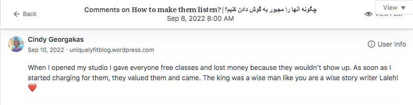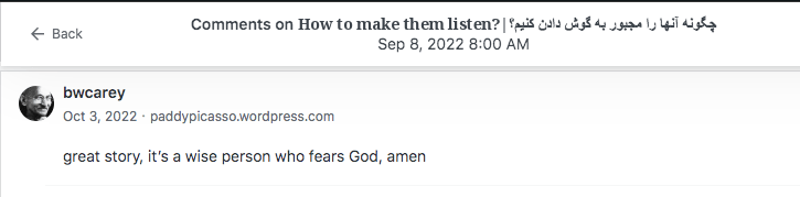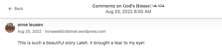 Reviews and comments By Laleh ChiniJanuary 13, 2024 ( 4 ) Thank you. Share this: Click to share on X (Opens in new window) X Click to share on Facebook (Opens in new window) Facebook Click to share on LinkedIn (Opens in new window) LinkedIn Click to share on Tumblr (Opens in new window) Tumblr Click to share on Telegram (Opens in new window) Telegram Like Loading... Categories: award winner, bedtime story, fable, folk tale, moralTags: moral, narrative, oracle, parable, short stories, Uncategorized Related Articles Be That One/Ψ’Ω ΫΪ©Ϋ Ψ¨Ψ§Ψ΄ By Laleh Chini14 hours ago Reviews and comments By Laleh Chini4 days ago The Price of Awareness/Ψ¨ΩΨ§Ϋ Ψ’Ϊ―Ψ§ΩΫ By Laleh Chini1 week ago 4 comments › christinenovalarue January 13, 2024 • 8:36 am π€ LikeLiked by 1 person Reply ↓ Laleh Chini January 13, 2024 • 6:41 pm πβ€οΈ LikeLike Reply ↓ 100 Country Trek January 14, 2024 • 6:28 pm Thanks π LikeLiked by 1 person Reply ↓ Laleh Chini January 15, 2024 • 6:05 pm ππ· LikeLiked by 1 person Reply ↓ Leave a comment Cancel reply Δ