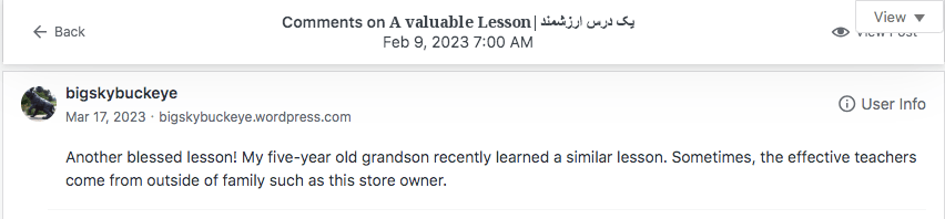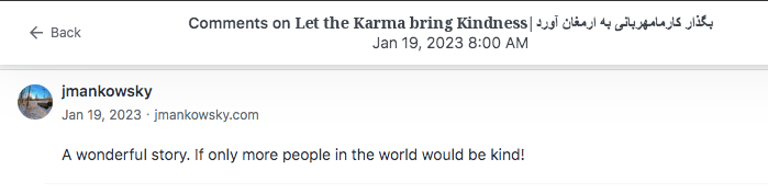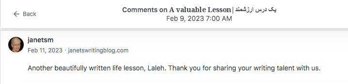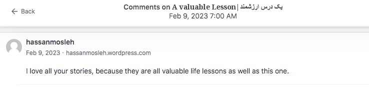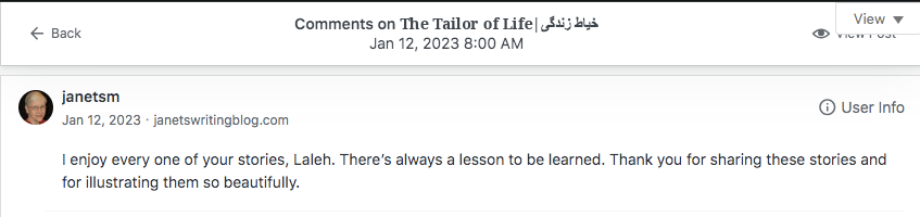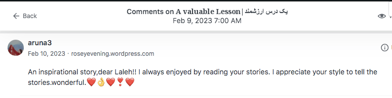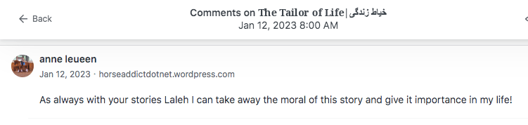 Reviews and comments By Laleh ChiniFebruary 10, 2024 ( 9 ) Thank you. Share this: Click to share on X (Opens in new window) X Click to share on Facebook (Opens in new window) Facebook Click to share on LinkedIn (Opens in new window) LinkedIn Click to share on Tumblr (Opens in new window) Tumblr Click to share on Telegram (Opens in new window) Telegram Like Loading... Categories: award winner, bedtime story, fable, folk tale, moral, StorytellingTags: moral, narrative, parable, short stories, Uncategorized Related Articles Be That One/آن یکی باش By Laleh Chini13 hours ago Reviews and comments By Laleh Chini4 days ago The Price of Awareness/بهای آگاهی By Laleh Chini1 week ago 9 comments › Paul - Cawston Greenway February 10, 2024 • 8:03 am What is Iran like as a country to live in? I’m sure the Western ideas are all wrong. LikeLiked by 1 person Reply ↓ Laleh Chini February 10, 2024 • 6:30 pm lol right now with the dictatorship, and terrorist government that invaded my country 45 years ago, we as Persian ran away. We’re hoping one day we will free our beautiful Iran. LikeLiked by 1 person Reply ↓ Paul - Cawston Greenway February 10, 2024 • 8:32 pm I hope so 🙂 LikeLiked by 1 person Laleh Chini February 11, 2024 • 8:55 pm 😍 LikeLiked by 1 person christinenovalarue February 10, 2024 • 9:55 am 🤍 LikeLiked by 1 person Reply ↓ Laleh Chini February 10, 2024 • 6:27 pm 🙏❤️ LikeLike Reply ↓ worldphoto12 February 11, 2024 • 4:22 am BUONA GIORNATA LikeLiked by 1 person Reply ↓ Laleh Chini February 11, 2024 • 8:55 pm 🙏🌷 LikeLiked by 1 person Reply ↓ worldphoto12 February 12, 2024 • 2:27 am 😉 LikeLiked by 1 person Leave a comment Cancel reply Δ