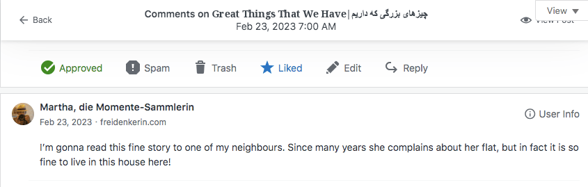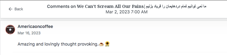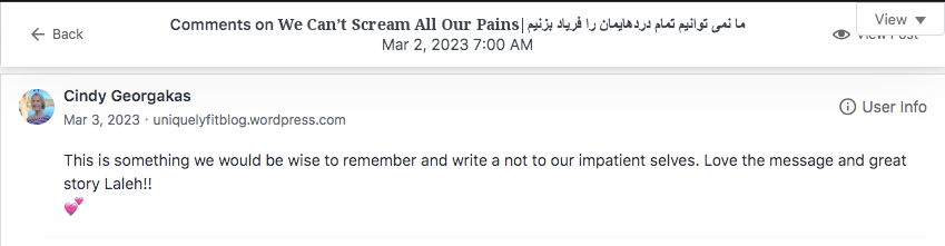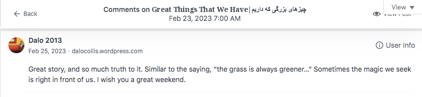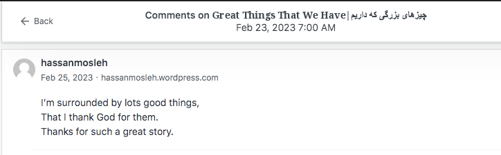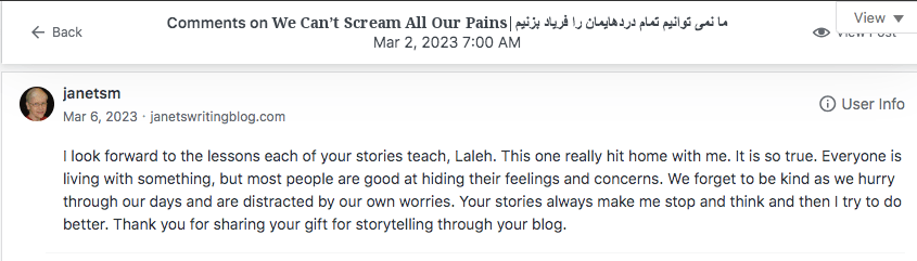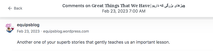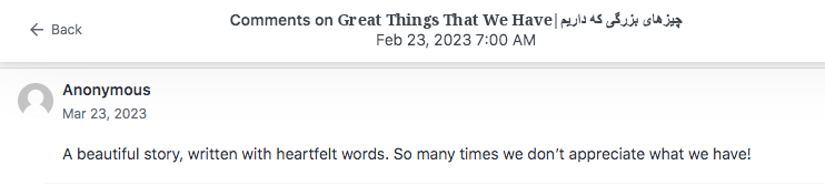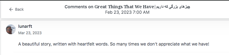 Reviews and comments By Laleh ChiniFebruary 24, 2024 ( 2 ) Thank you. Share this: Click to share on X (Opens in new window) X Click to share on Facebook (Opens in new window) Facebook Click to share on LinkedIn (Opens in new window) LinkedIn Click to share on Tumblr (Opens in new window) Tumblr Click to share on Telegram (Opens in new window) Telegram Like Loading... Categories: award winner, bedtime story, fable, folk tale, moral, Short Story, StorytellingTags: moral, narrative, parable, short stories, Uncategorized Related Articles Our Own True Place/جایگاه واقعی ما By Laleh Chini1 day ago Reviews and comments By Laleh Chini4 days ago Expensive Return Ticket/بلیط رفت و برگشت گرانقیمت By Laleh Chini1 week ago 2 comments › Ultra February 24, 2024 • 2:07 pm Beautiful! LikeLiked by 1 person Reply ↓ Laleh Chini February 24, 2024 • 5:36 pm Thank you 🙏 LikeLike Reply ↓ Leave a comment Cancel reply Δ