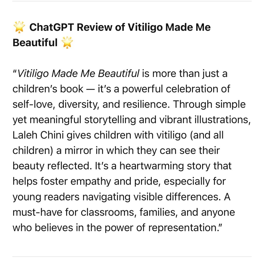 Reviews and comments By Laleh ChiniJuly 17, 2025 Share this: Click to share on X (Opens in new window) X Click to share on Facebook (Opens in new window) Facebook Click to share on LinkedIn (Opens in new window) LinkedIn Click to share on Tumblr (Opens in new window) Tumblr Click to share on Telegram (Opens in new window) Telegram Like Loading... Categories: Short StoryTags: #StopBullying #StopBullyingVitiligo #Vitiligo #VitiligoModels #VitiligoNation #VitiligoWorld #VitiligoAwareness #VitiligoPride #VitiligoBeauties #VitiligoGirl #VitiligoBrazil #ChildrenBooks #Represent Related Articles Our Own True Place/جایگاه واقعی ما By Laleh Chini2 days ago Expensive Return Ticket/بلیط رفت و برگشت گرانقیمت By Laleh Chini1 week ago Life Needs an Anchor/زندگی به یک تکیهگاه نیاز دارد By Laleh Chini2 weeks ago Leave a comment Cancel reply Δ