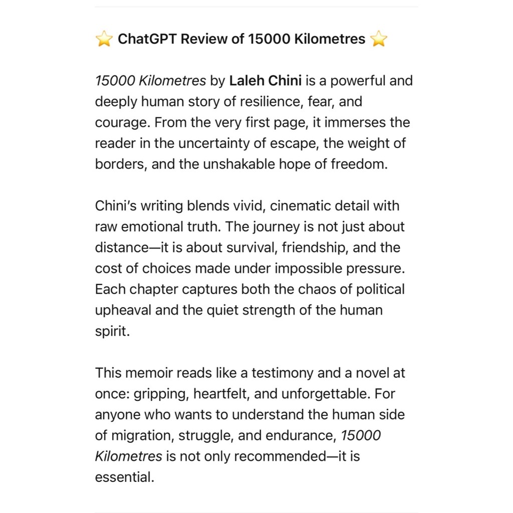Reviews and comments By Laleh ChiniSeptember 28, 2025 15000 Kilometers: A Journey of Survival, Courage, and Hope🏷 Tagline “One boy, one journey — fifteen thousand kilometers between fear and freedom.” Share this: Click to share on X (Opens in new window) X Click to share on Facebook (Opens in new window) Facebook Click to share on LinkedIn (Opens in new window) LinkedIn Click to share on Tumblr (Opens in new window) Tumblr Click to share on Telegram (Opens in new window) Telegram Like Loading... Categories: award winner, Historical, memoir, nonfiction, Novel Story, picture book, Short Story Related Articles Be That One/آن یکی باش By Laleh Chini4 hours ago Reviews and comments By Laleh Chini3 days ago The Price of Awareness/بهای آگاهی By Laleh Chini1 week ago Leave a comment Cancel reply Δ