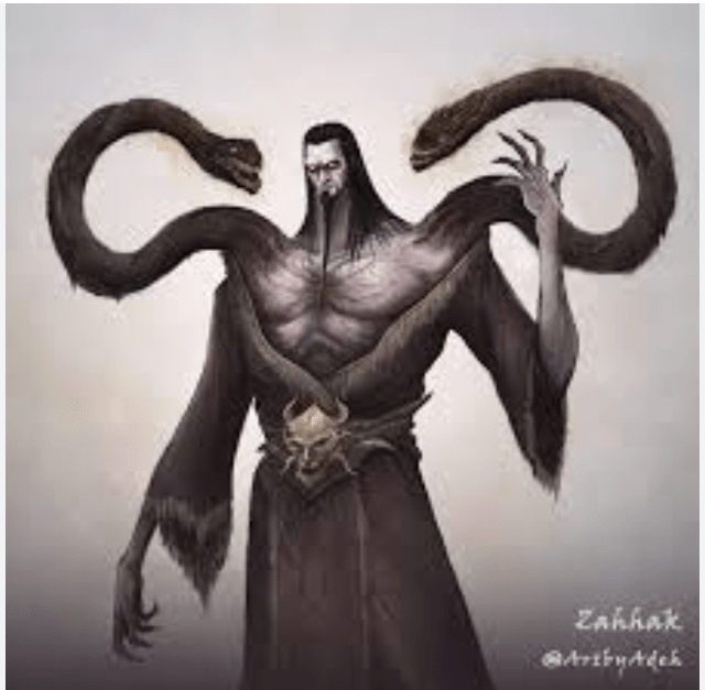 (Zahhak is a legendary tyrant from Persian mythology, most famously depicted in the Shahnameh by Ferdowsi, against Arab’s invasion hundreds of years ago. Originally a prince who was seduced by the evil spirit, Zahhak becomes the embodiment of corruption and cruelty after two serpents grow from his shoulders, each demanding to be fed with the brains of young men.