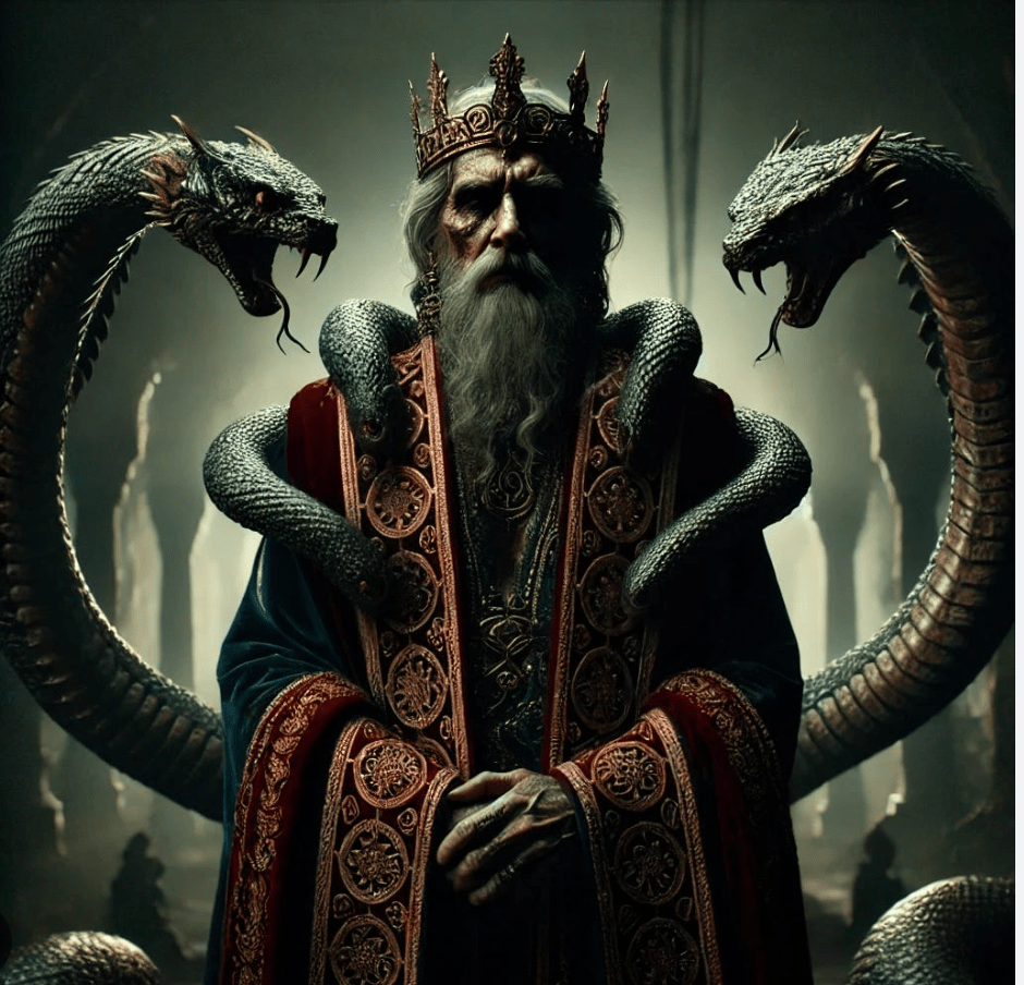 The next day, his shoulders are wounded. The wounds open, and from the king’s body two black snakes crawl out, dark, hungry, merciless. Symbols of regression, oppression, and endless greed.